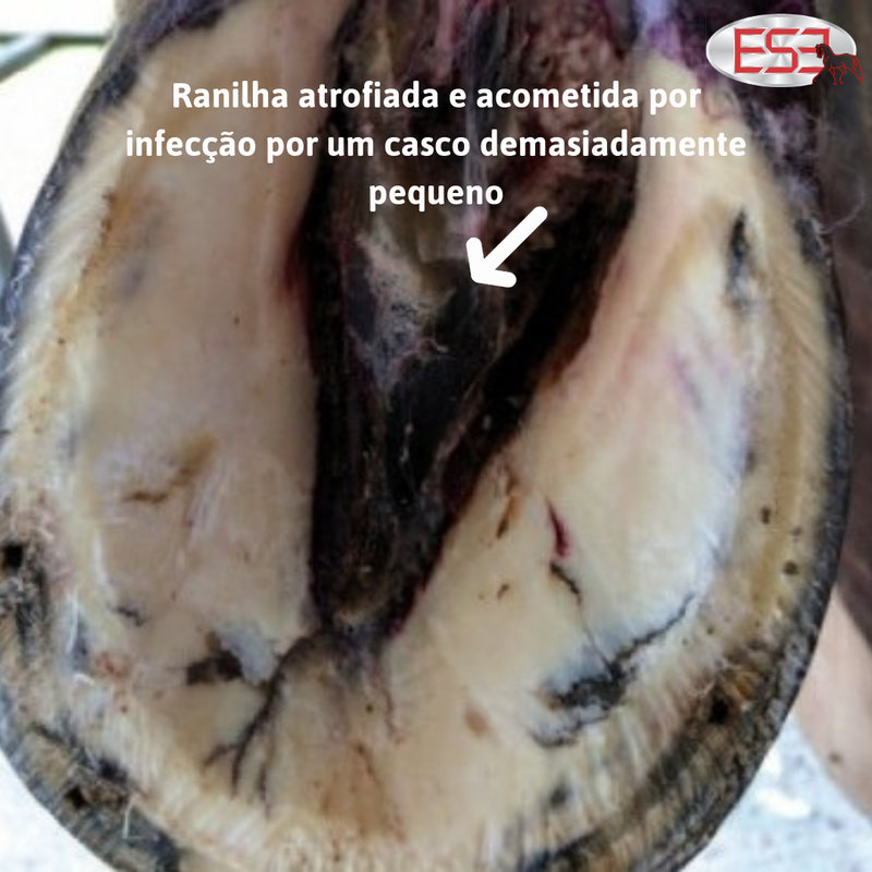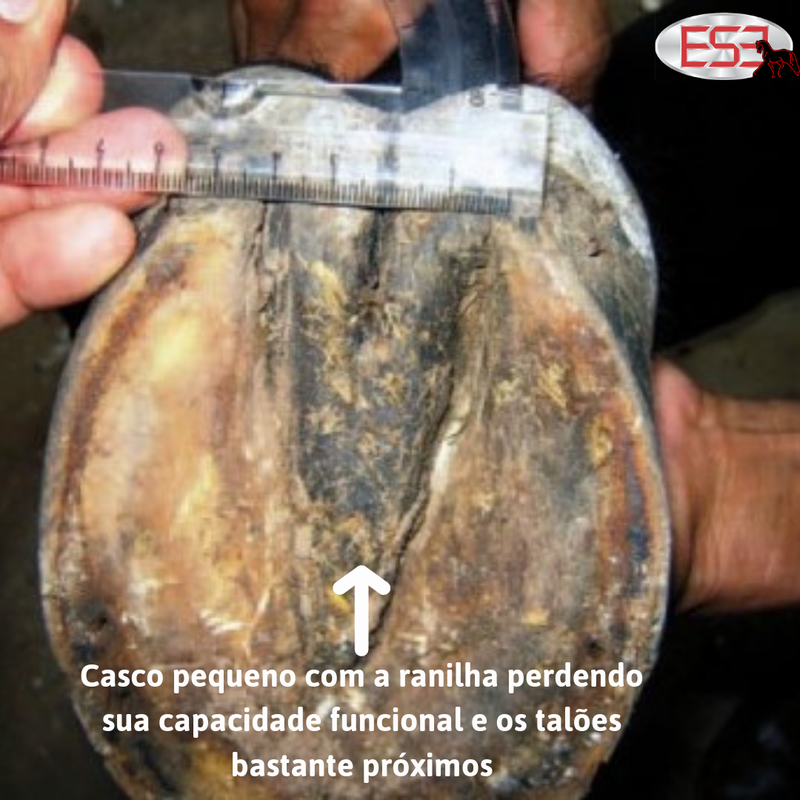 Infelizmente alguns criadores de determinadas raças vem cada vez mais selecionando cavalos com cascos menores e utilizam-se deste parâmetro como um aspecto positivo para a classificação dos melhores animais para perpetuarem as boas características da raça. Entretanto, esquecem de uma regra básica da física que diz: “Quanto maior o peso aplicado em uma menor área, maior a pressão”. Assim sendo, o peso de um cavalo aplicado a cascos diminutos gera grande quantidade de pressão por centímetro quadrado elevando substancialmente o número de patologias, principalmente, relacionadas ao impacto. Estudos recentes vêm relacionado situações patológicas em cavalos de cascos demasiadamente pequenos. Em 1988, o médico veterinário Tracy Turner correlacionou a maior incidência da Síndrome podotroclear (Síndrome navicular) em cavalos com cascos pequenos. A atrofia de ranilha, encastelamento, compressão e calcificação das cartilagens colaterais, rachaduras e a incapacidade funcional de expansão dos talões e de amortecimento são algumas situações mais frequentes e passíveis de ocorrer em cascos pequenos. Assim sendo, Kaneps et al. (1988) apresentou a seguinte fórmula para calcular o tamanho dos cascos de potros: